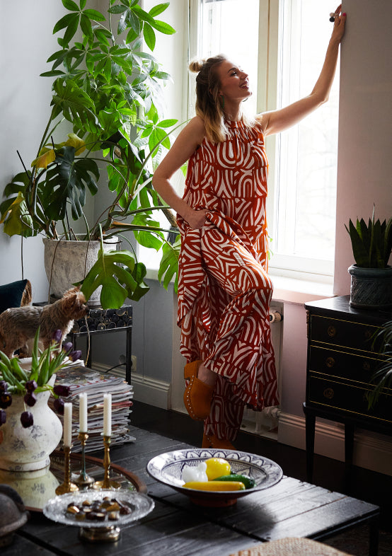 Nooralla Merilii-mekko Kaari-kuosissa ja kuparin sävyisenä. Mekon alle Noora valitsi Tuike-housut Kaari-kuosissa.