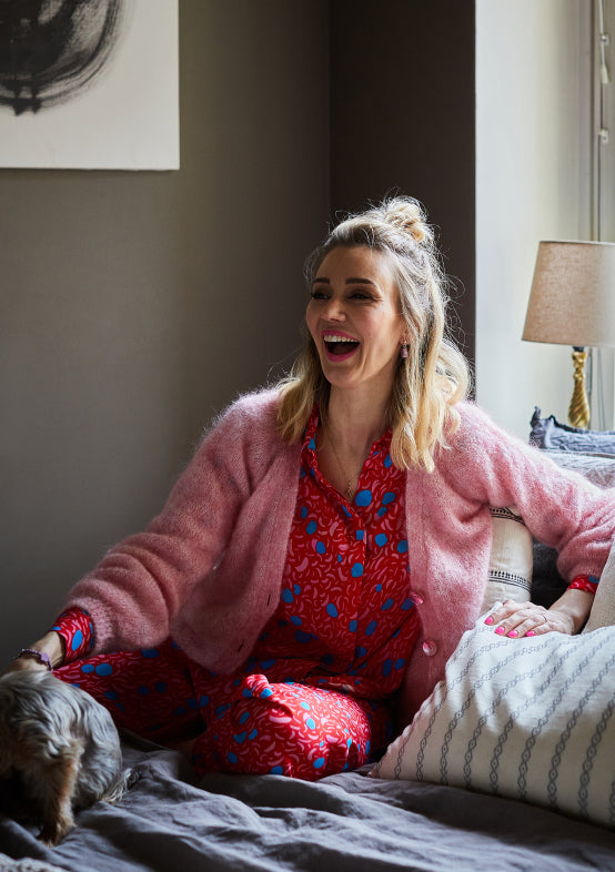 Nooralla on Aarikan kevään 2024 mallistosta punainen Tiila-paita Tuovi-kuosissa ja Tuike-housut samassa kuosissa. Neuletakki on Saimi vaaleanpunaisena.