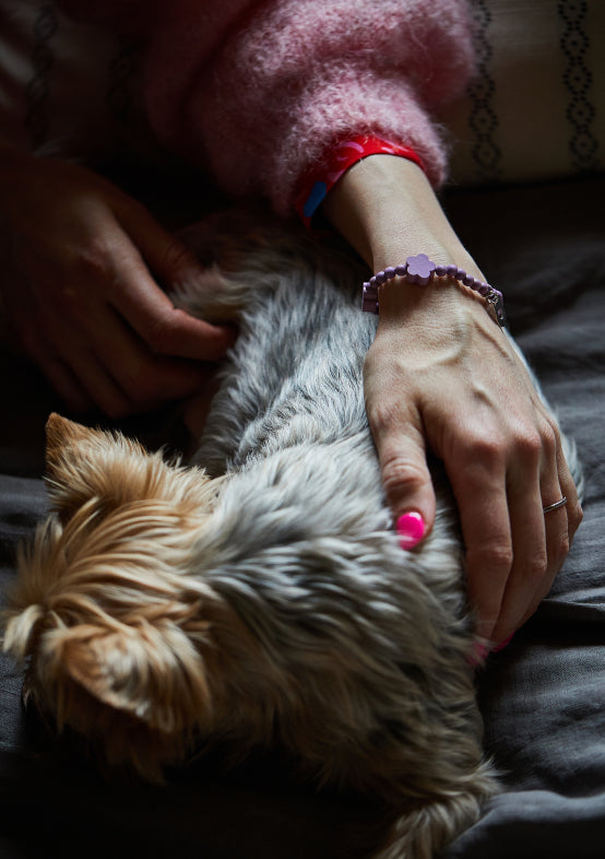 Puunaisen asun kanssa sopii hempeän liila Puistolemmikki-rannekoru ja saman sarjan Puistolemmikki-korvakorut.