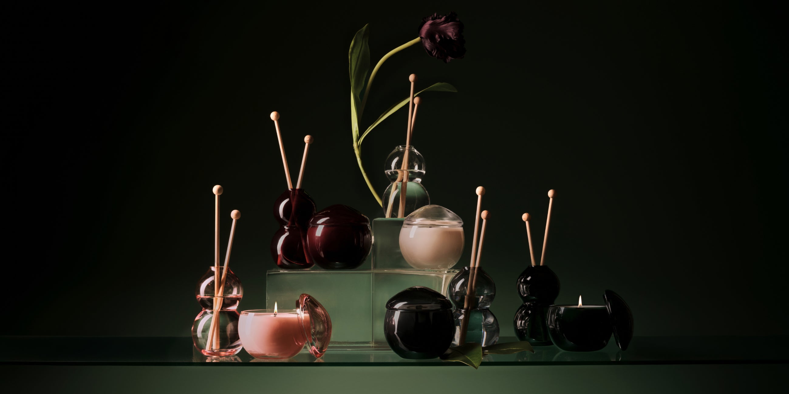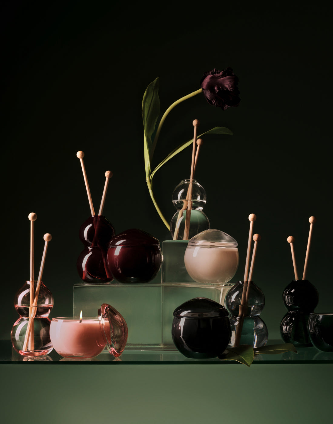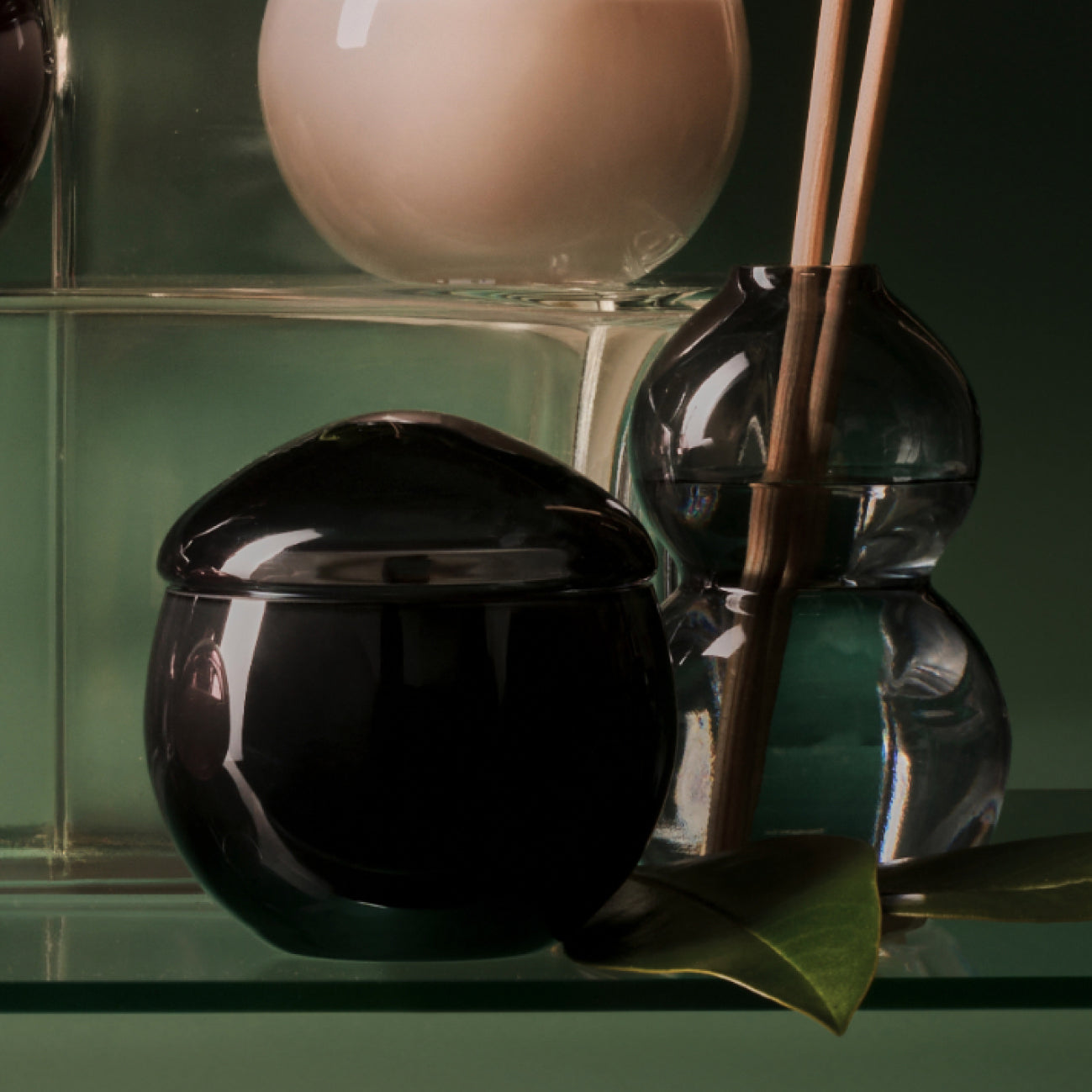 Käsityönä kotimaassa valmistettujen huonetuoksujen lasinen pullo ja soijavahasta valmistettujen tuoksukynttilöiden lasinen rasia toistavat ikonisen Aarikan pyöreää muotokieltä kauniisti. Huonetuoksujen puutikut ovat kuin pala puhdasta metsää, ja tuoksukynttilöiden männystä valmistettu puusydän palaa puhtaasti ja vähäpäästöisesti – hennon tunnelmallisesti ritisten.