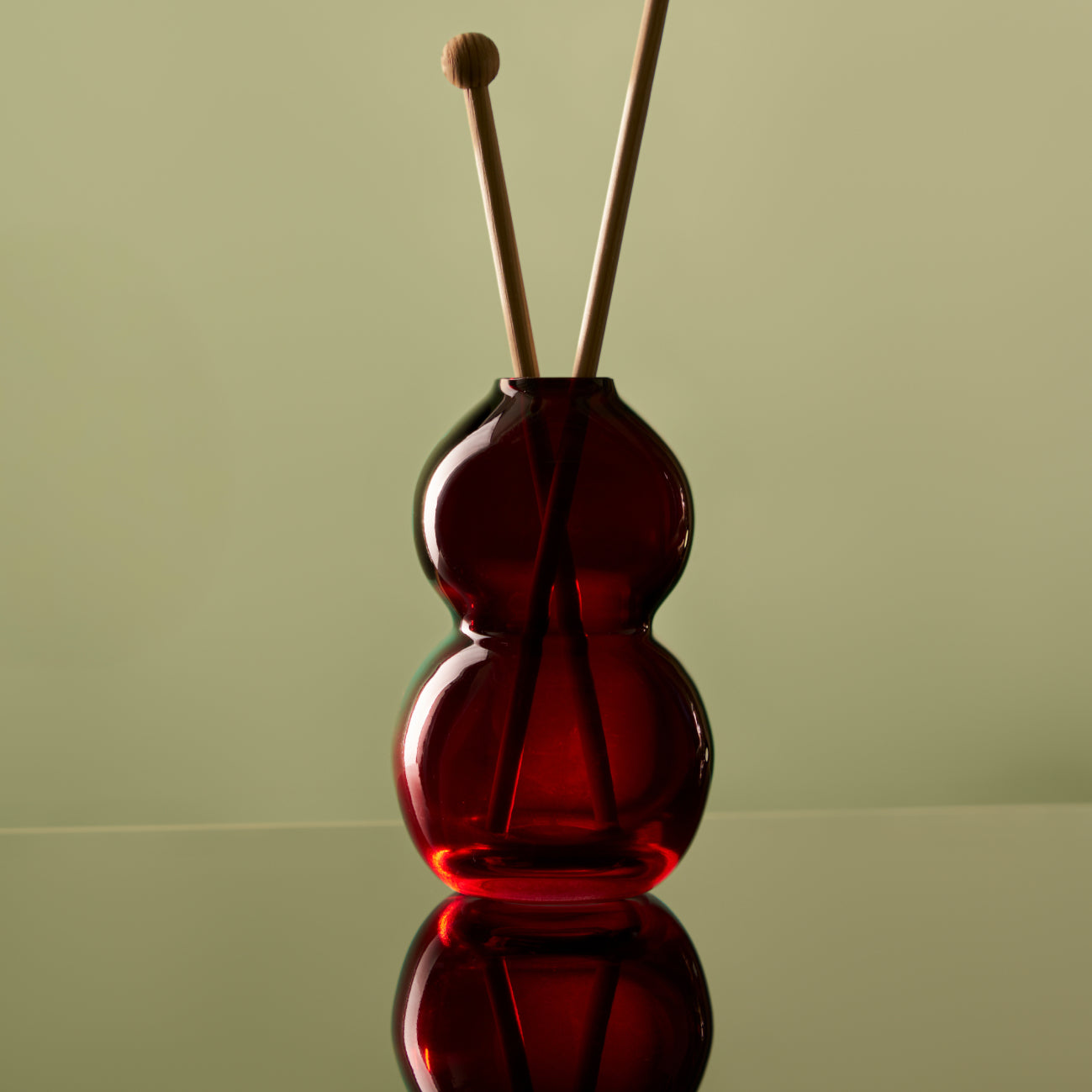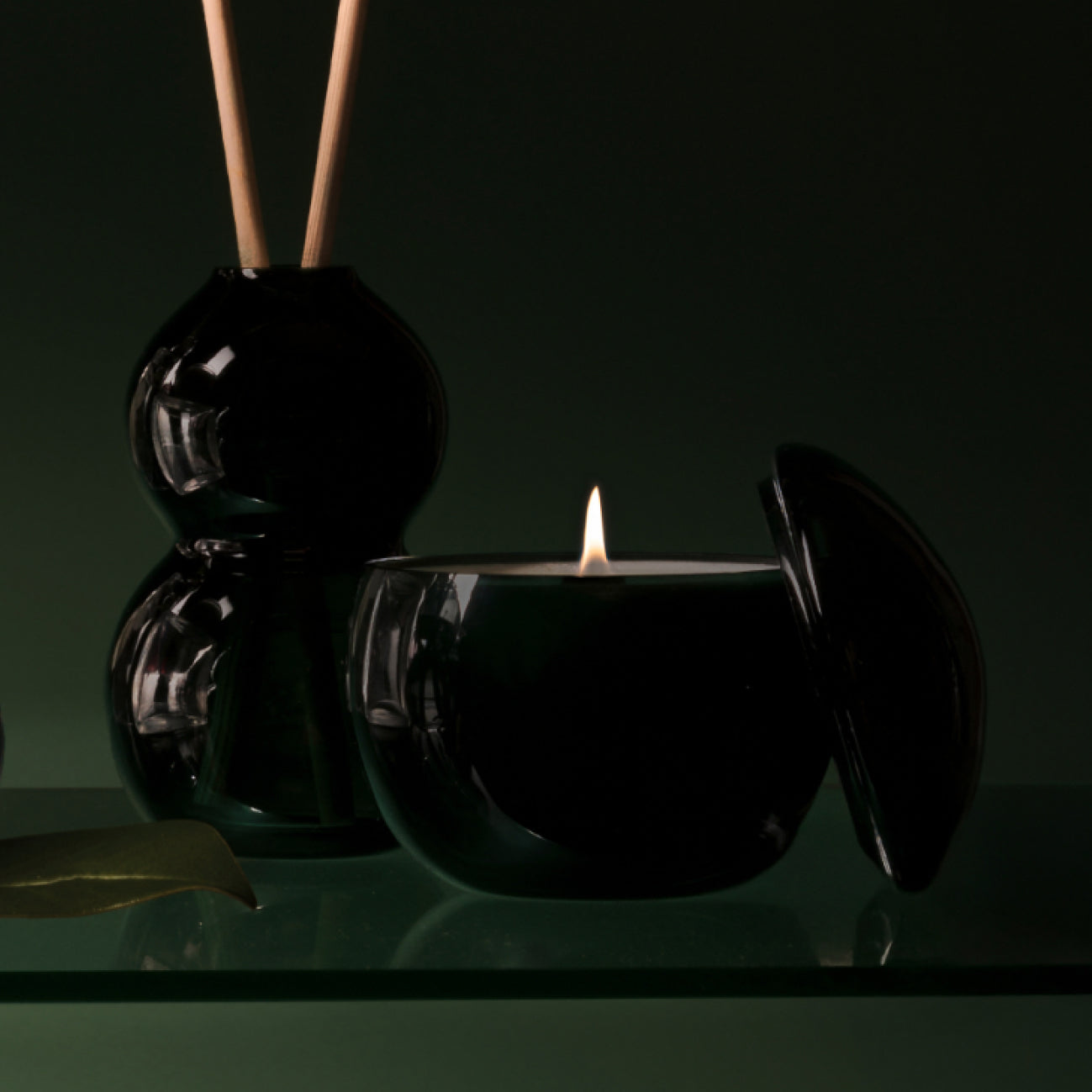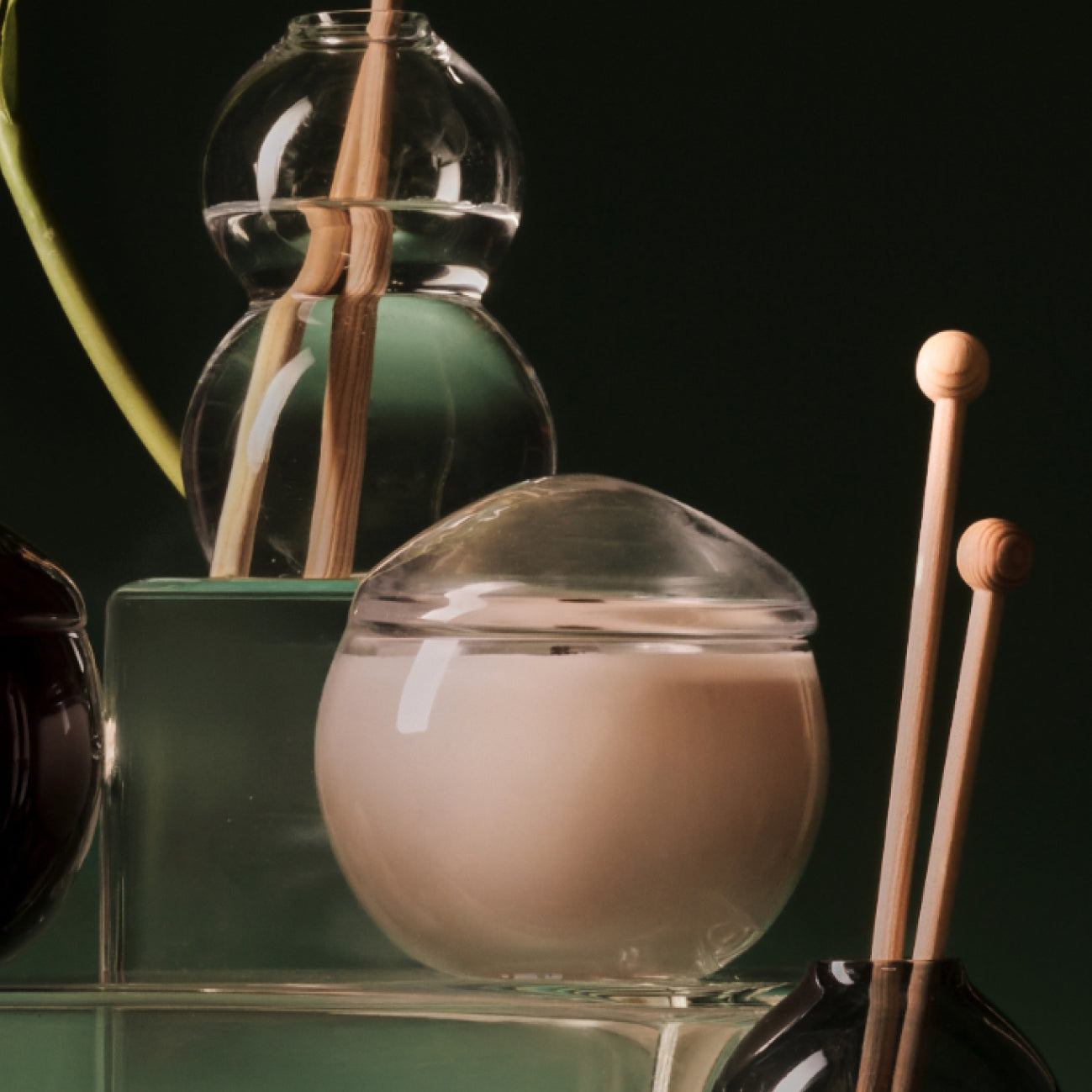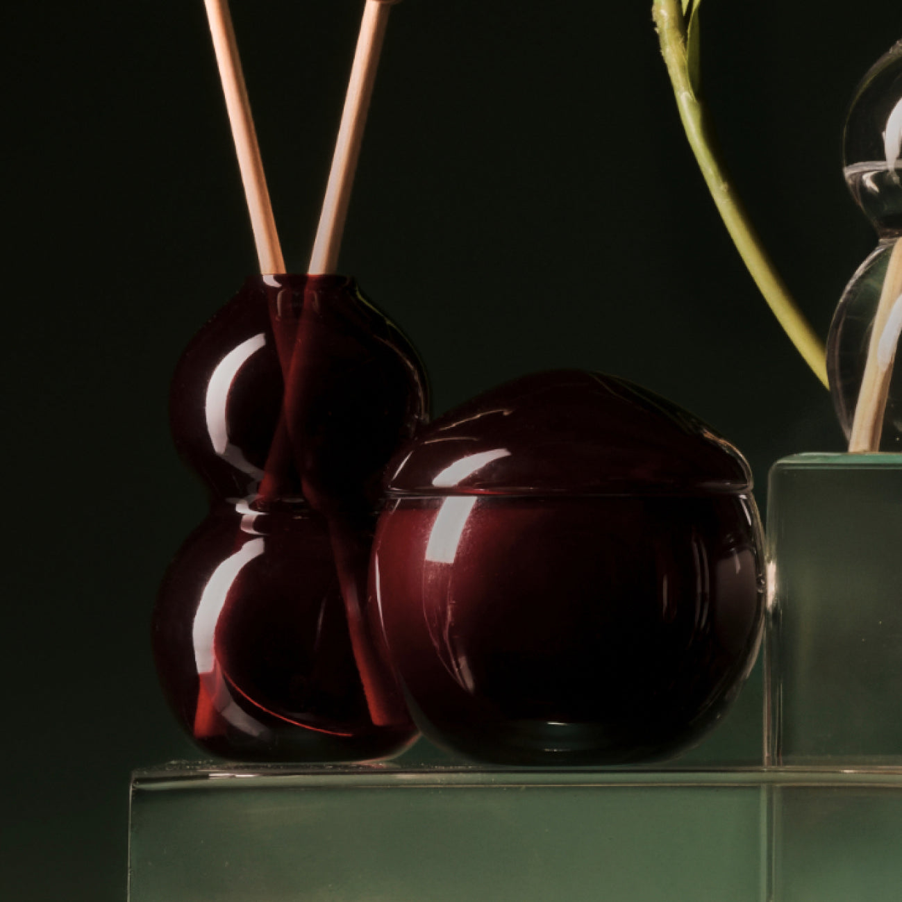 Käsityönä kotimaassa valmistettujen huonetuoksujen lasinen pullo ja soijavahasta valmistettujen tuoksukynttilöiden lasinen rasia toistavat ikonisen Aarikan pyöreää muotokieltä kauniisti. Huonetuoksujen puutikut ovat kuin pala puhdasta metsää, ja tuoksukynttilöiden männystä valmistettu puusydän palaa puhtaasti ja vähäpäästöisesti – hennon tunnelmallisesti ritisten.