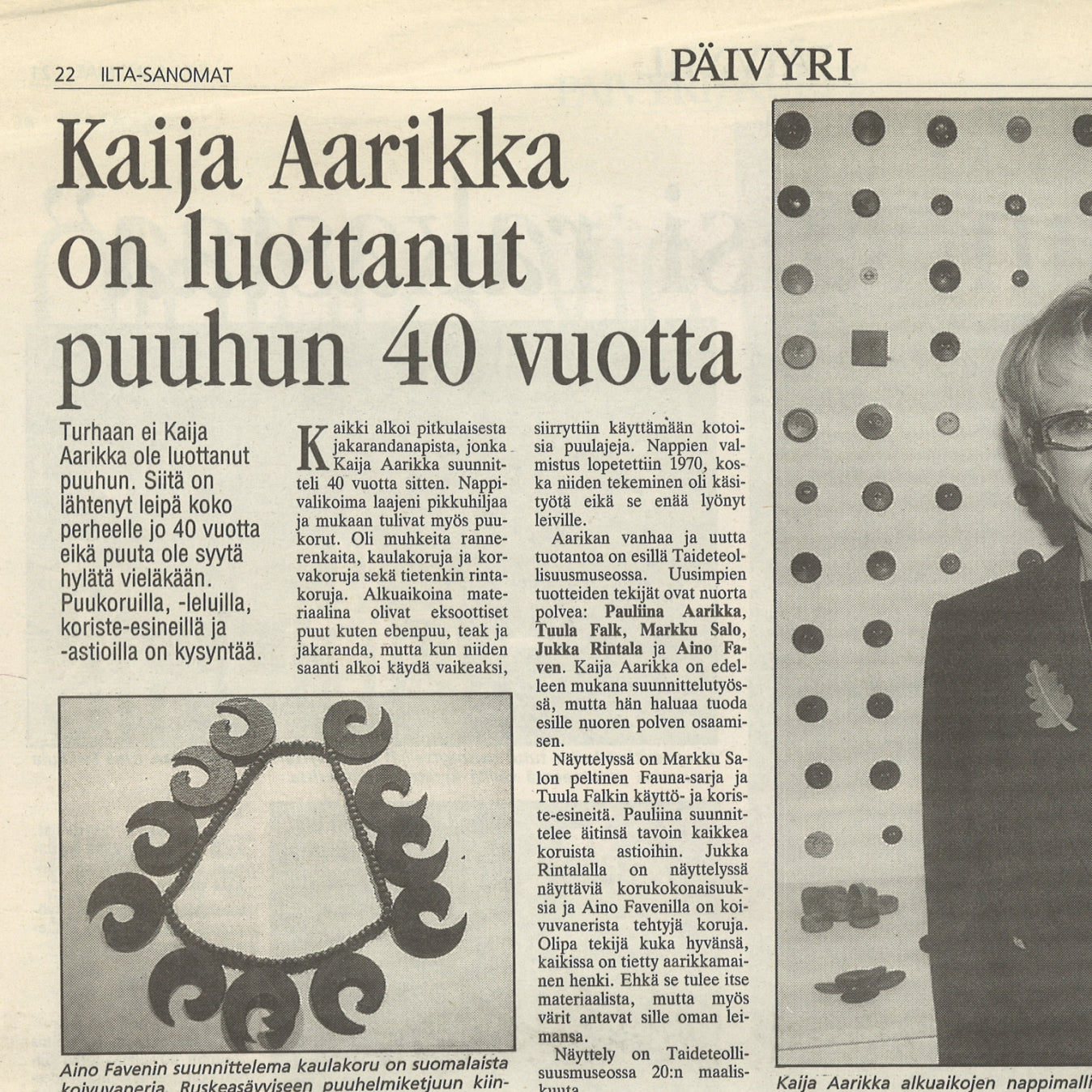 Aarikan 40-vuotisjuhlan kunniaksi Kaj Kalin kirjoittaa yrityksen historiikin ja näyttely järjestetään Taideteollisuusmuseossa. Näyttelyyn osallistuvat myös lasitaiteilija Markku Salo, sisustusarkkitehti Tuula Falk, korusuunnittelija Aino Faven ja muotisuunnittelija Jukka Rintala. Mukana ovat myös Pauliina Aarikan suunnittelemat, perinteisten saviastioiden muotoja mukailevat suuret puuvadit ja lautaset. Helsingistä näyttely jatkaa Osloon ja Tokioon.