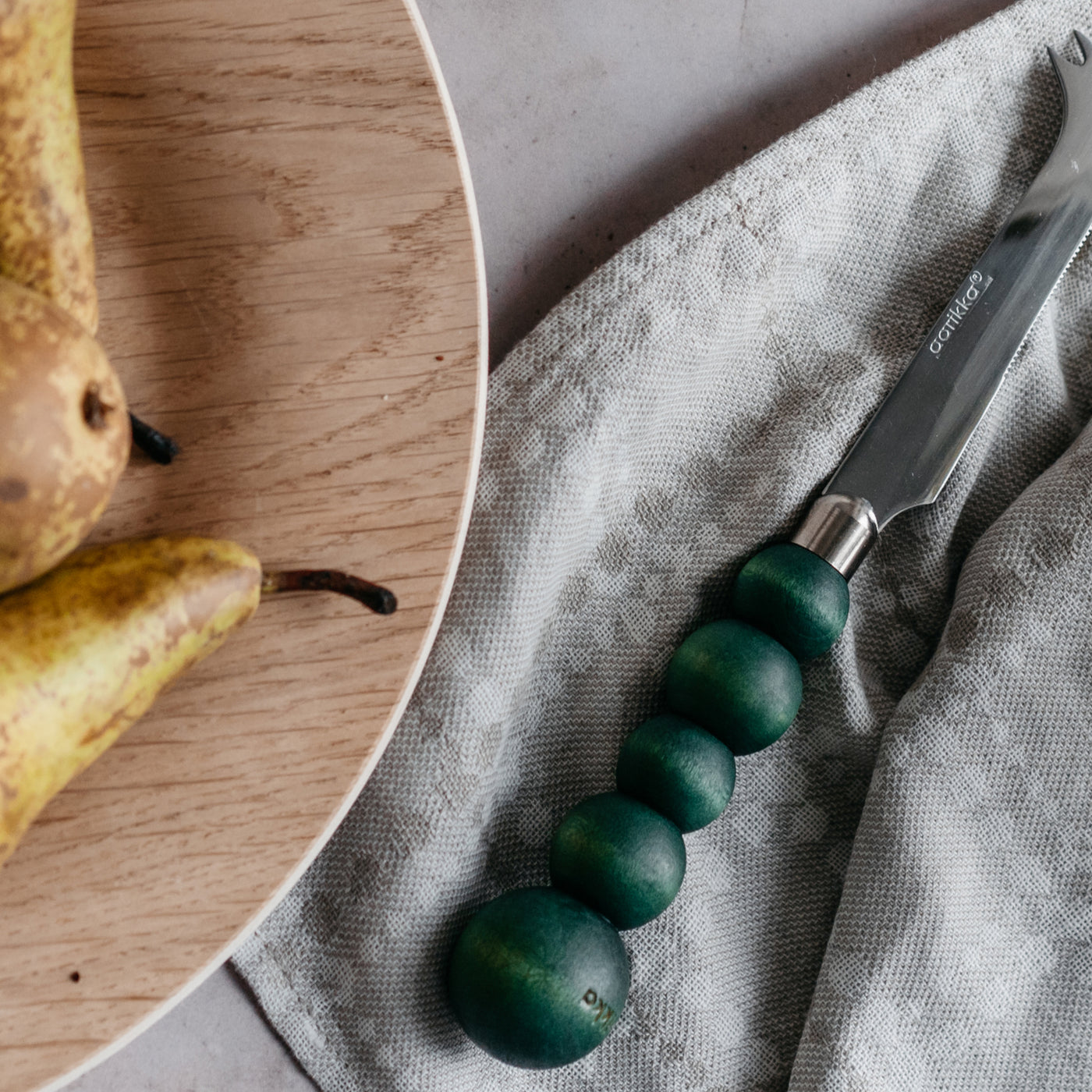 Tuotteet valmistetaan käsityönä, mikä näkyy niiden ominaisuuksissa ja volyymeissä – että valmistetaan pieniä eriä tarpeeseen, ja että eläväkin saa näkyä. Niin kuin siinä vaaleassa raidassa Aarikan puuhelmissä, joka syntyy Kaijan aviomiehen Erkki Ruokosen kehittämästä ainutlaatuisesta tekniikasta, jolla kaikki aarikkalaiset puutuotteet käsin värjätään Raisiossa.